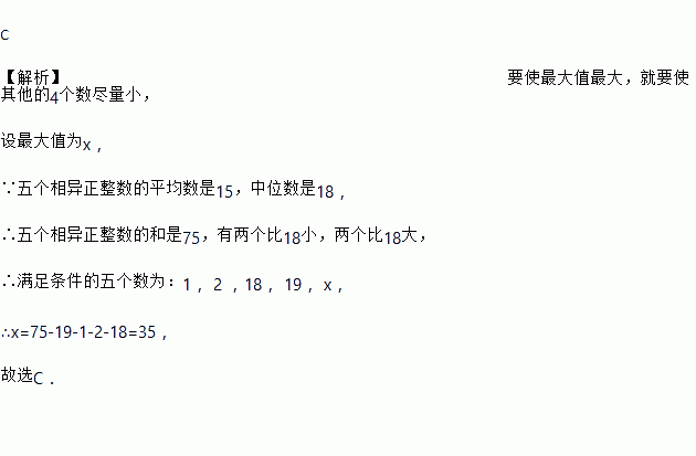 假设五个相异正整数的平均数是15,中位数是18,则这五个相异正整数中的最大数的最大值为( )
