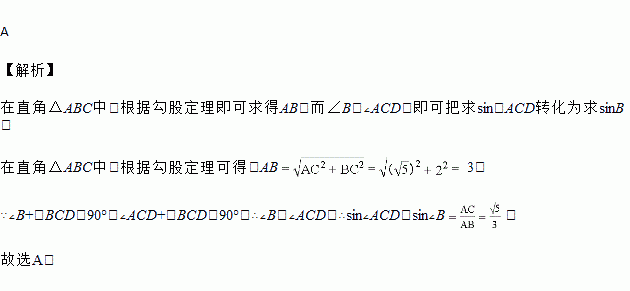 如图,在Rt△ABC中,∠ACB=90°,CD⊥AB,垂足为D.若AC=,BC=2,则sin∠ACD的值为( )
