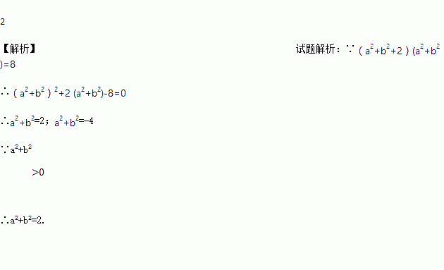 已知(a2+b2+2)(a2+b2)=8,那么a2+b2的值为_______________.