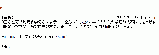 B 【解析】试题分析:绝对值小于1的正数也可以利用科学记数法表示,一般形式为a×10﹣n,与较大数的科学记数法不同的是其所使用的是负指数幂,指数由原数左边起第一个不为零的数字前面的0的个数所决定. 将0.000075用科学记数法表示为:7.5×10﹣5. 故选B.