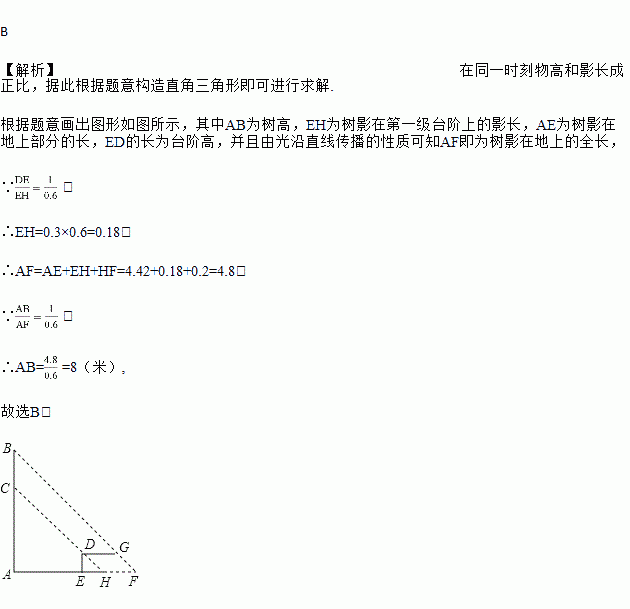 在阳光下,一名同学测得一根长为1米的垂直地面的竹竿的影长为0.6米,同时另一名同学测量树的高度时,发现树的影子不全落在地面上,有一部分落在教学楼的第一级台阶上,测得此影子长为0.2米,一级台阶高为0.3米,如图所示,若此时落在地面上的影长为4.42米,则树高为( )