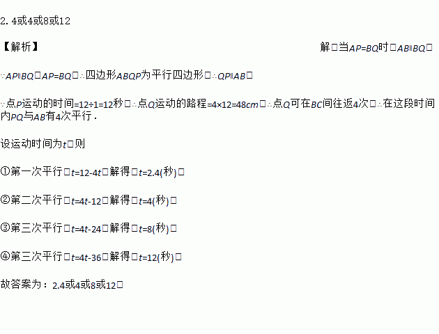 如图,在矩形ABCD中,AB=4 cm,AD=12 cm,点P在AD边上以每秒1 cm的速度从点A向点D运动,点Q在BC边上,以每秒4 cm的速度从点C出发,在CB间往返运动,两个点同时出发,当点P到达点D时停止(同时点Q也停止),在这段时间内,当运动时间=_____时线段PQ∥AB.