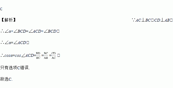 如图,点A为∠α边上任意一点,作AC⊥BC于点C,CD⊥AB于点D,下列用线段比表示cosα的值,错误的是( )