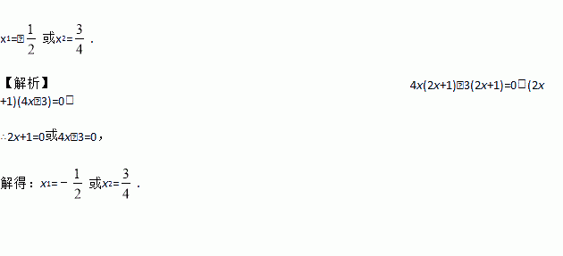 x1=﹣或x2=. 【解析】4x(2x+1)﹣3(2x+1)=0,(2x+1)(4x﹣3)=0, ∴2x+1=0或4x﹣3=0, 解得:x1=﹣或x2=.