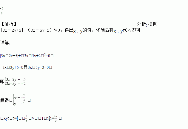已知|3x﹣2y+5|+(3x﹣5y+2)2=0,求(xy2)2的值