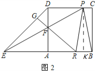 如图1,边长为2的正方形ABCD中,E是BA延长线上一点,且AE=AB,点P从点D出发,以每秒1个单位长度沿D→C→B向终点B运动,直线EP交AD于点F,过点F作直线FG⊥DE于点G,交AB于点R.