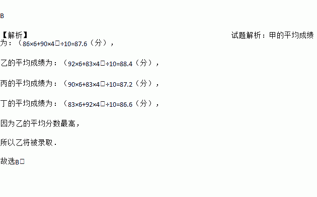如果公司认为,作为公关人员面试的成绩应该比笔试的成绩更重要,并分别赋予它们6和4的权.根据四人各自的平均成绩,公司将录取( )
