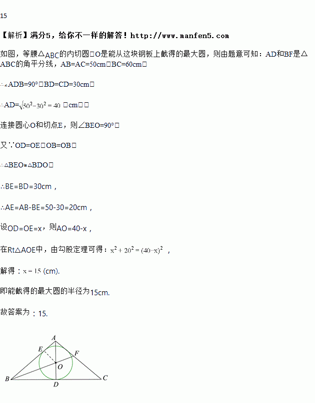 已知一块等腰三角形钢板的底边长为60cm,腰长为50 cm,能从这块钢板上截得得最大圆得半径为________cm