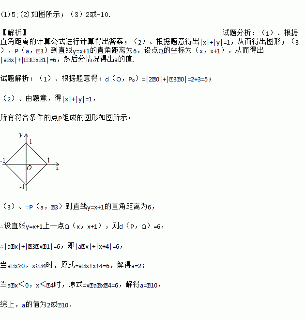 (3)设P0(x0,y0)是一定点,Q(x,y)是直线y=ax+b上的动点,我们把d(P0,Q)的最小值叫做P0到直线y=ax+b的直角距离. 若P(a,-3)到直线y=x+1的直角距离为6,求a的值.