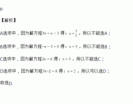 A. 3x=x+3 B. ﹣x+3=0 C. 2x=6 D. 5x﹣2=8