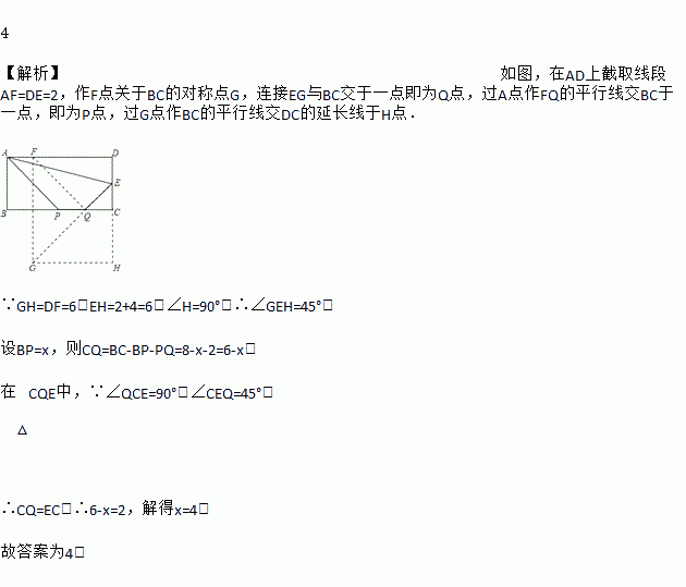 如图,矩形ABCD中,AB=4,BC=8,E为CD边的中点,点P、Q为BC边上两个动点,且PQ=2,当四边形APQE的周长最小时,BP=____________.