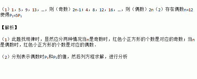 (2)在边长为n(n≥1)的正方形中,设黑色小正方形的个数为P1,白色小正方形的个数为P2,问是否存在偶数n,使P2=5P1?若存在,请写出n的值;若不存在,请说明理由.