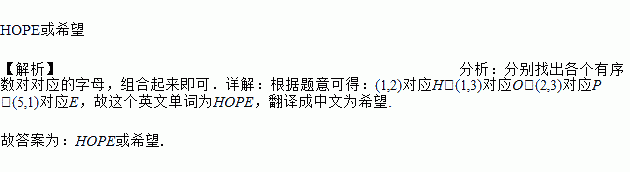 有一个英文单词的字母顺序对应如图中的有序数对分别为(1,2),(1,3),(2,3),(5,1),请你把这个英文单词写出来或者翻译成中文为_______.
