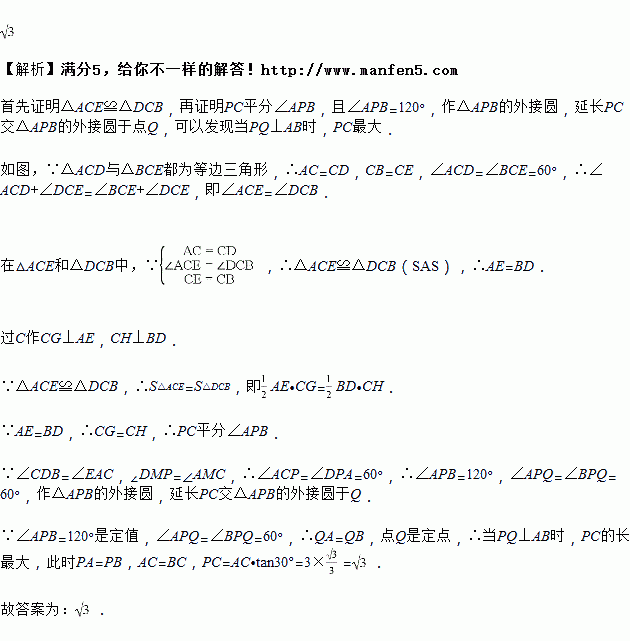 如图,点C是线段AB上的动点,分别以AC、BC为边在AB的同侧作等边△ACD、等边△BCE,BD、AE交于点P.若AB=6,则PC的最大值为_____.