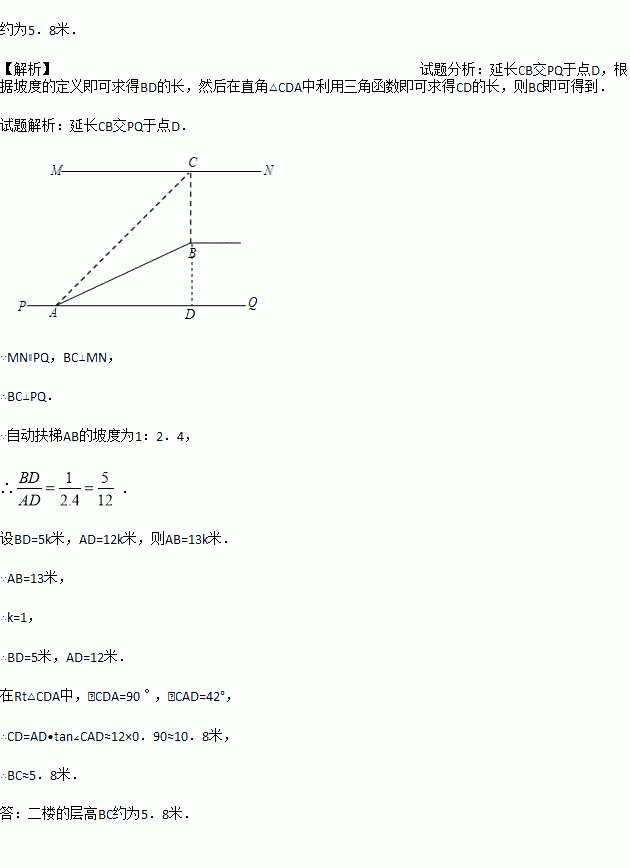 (本小题满分8分) 如图1,某超市从底楼到二楼有一自动扶梯,图2是侧面示意图.已知自动扶梯AB的坡度为1:2.4,AB的长度是13米,MN是二楼楼顶,MN∥PQ,C是MN上处在自动扶梯顶端B点正上方的一点,BC⊥MN,在自动扶梯底端A处测得C点的仰角为42°,求二楼的层高BC(精确到0.1米).(参考数据:sin42°≈0.67,cos42°≈0.74,tan42°≈0.90)