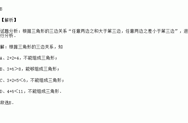 B 【解析】 试题分析:根据三角形的三边关系“任意两边之和大于第三边,任意两边之差小于第三边”,进行分析. 【解析】 根据三角形的三边关系,知 A、2+2=4,不能组成三角形; B、3+6>8,能够组成三角形; C、3+2=5<6,不能组成三角形; D、4+6<11,不能组成三角形. 故选B.