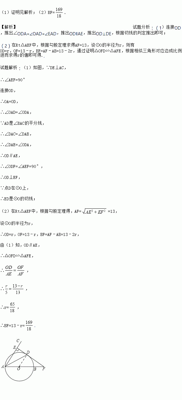 (2)若ED,AB的延长线相交于F,且AE=5,EF=12,求BF的长.
