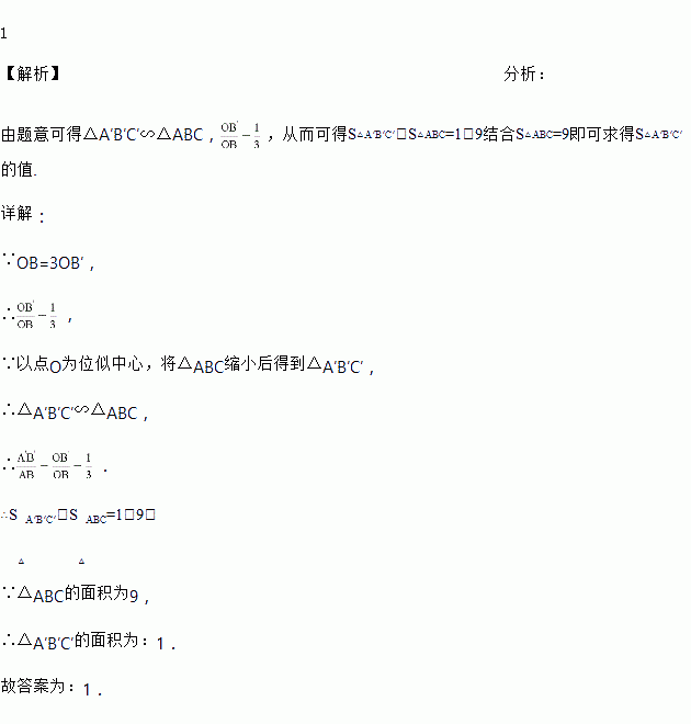 如图,以点O为位似中心,将△ABC缩小后得到△A′B′C′,已知OB=3OB′,若△ABC的面积为9,则△A′B′C′的面积为_____;