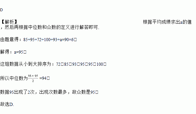 在《数据的分析》章节测试中,“勇往直前”学习小组6位同学的平均成绩是90,其个人成绩分别是85,95,72,100,93,a,则这组数据的中位数和众数分别是( )
