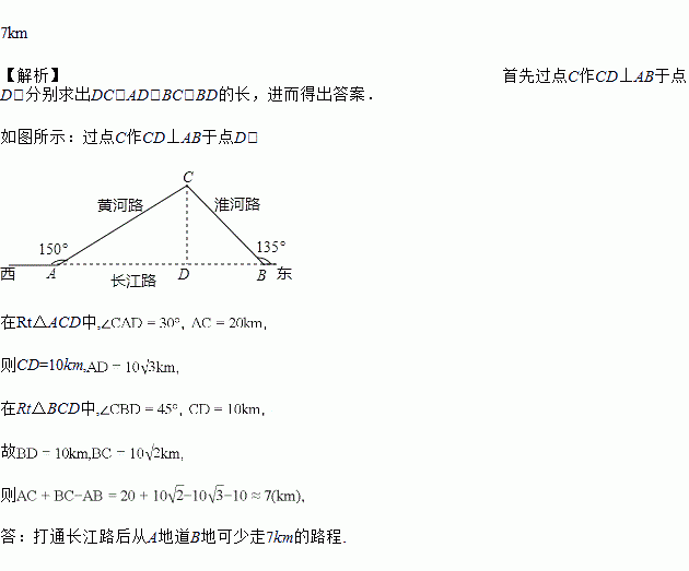 如图,已知长江路西段与黄河路的夹角为150°,长江路东段与淮河路的夹角为135°,黄河路全长AC=20km,从A地道B地必须先走黄河路经C点后再走淮河路才能到达,城市道路改造后,直接打通长江路(即修建AB路段).问:打通长江路后从A地道B地可少走多少路程?(参考数据:
