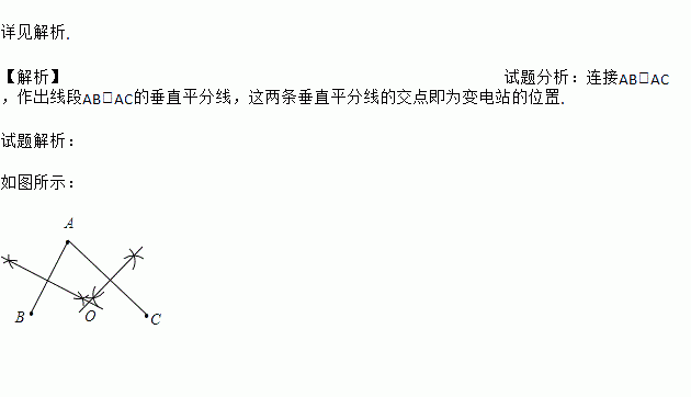 某镇要建一个变电站,使它到A、B、C 三个村的距离相等。请你找出变电站的位置。