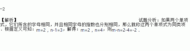 若单项式与单项式﹣5xmy3是同类项,则m﹣n的值为________.