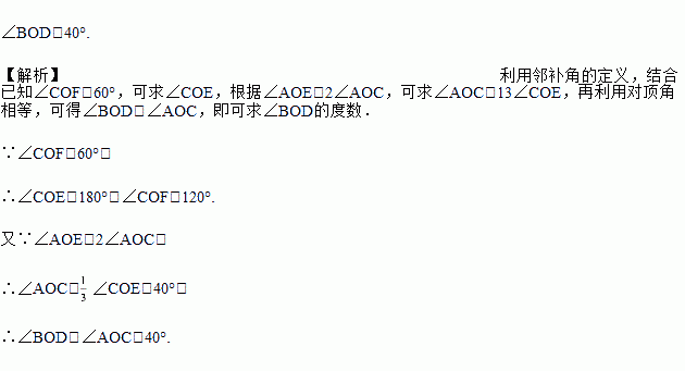 如图,三条直线AB,CD,EF相交于同一点O.若∠AOE=2∠AOC,∠COF=60°,求∠BOD的度数.