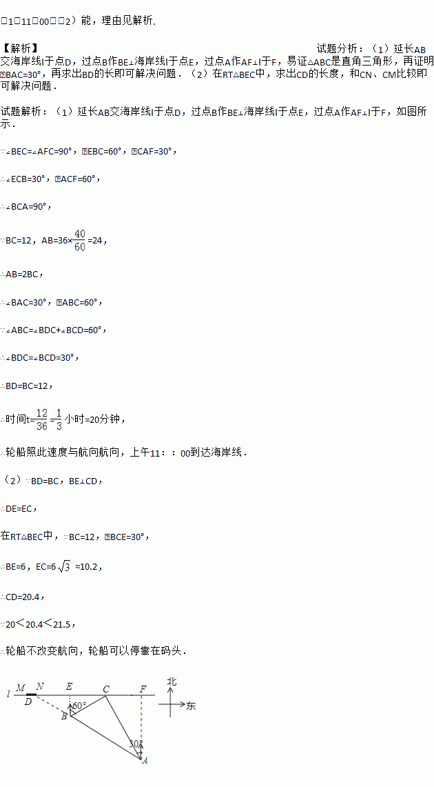 如图,在一条笔直的东西向海岸线l上有一长为1.5km的码头MN和灯塔C,灯塔C距码头的东端N有20km.一轮船以36km/h的速度航行,上午10:00在A处测得灯塔C位于轮船的北偏西30°方向,上午10:40在B处测得灯塔C位于轮船的北偏东60°方向,且与灯塔C相距12km.