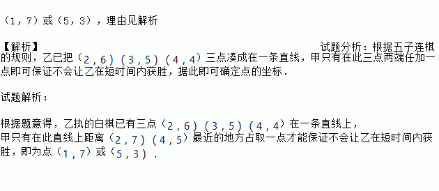 五子连珠棋和象棋、围棋一样,深受广大棋友的喜爱,其规则是:15×15的正方形棋盘中,由黑方先行,轮流弈子,在任一方向上连成五子者为胜.如图是两个五子棋爱好者甲和乙的对弈图(甲执黑子先行,乙执白子后走),观察棋盘思考:若A点的位置记作(8,4),甲必须在哪个位置上落子,才不会让乙在短时间内获胜?为什么?