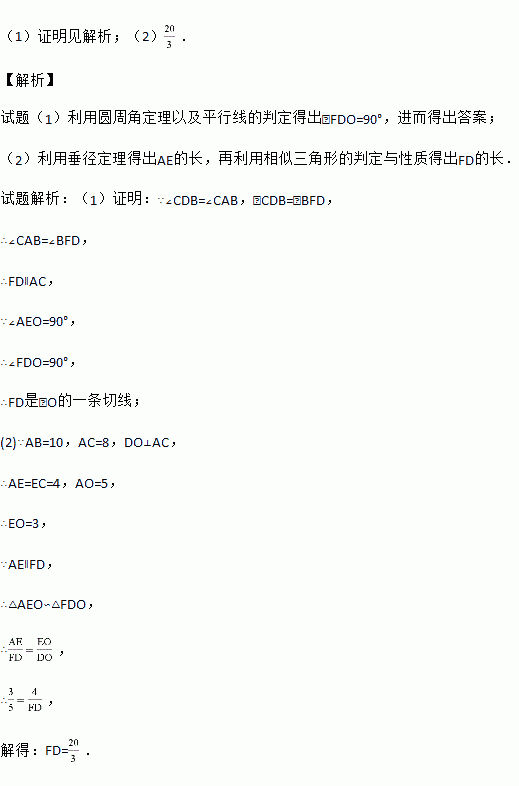 如图,AB是⊙O的直径,OD垂直于弦AC于点E,且交⊙O于点D,F是BA延长线上一点,若∠CDB=∠BFD.
