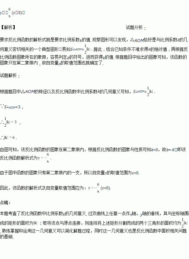 如图,反比例函数y=的图象在第二象限内,点A是图象上的任意一点,AM⊥x轴于点M,O是原点.若S△AOM=3,求该反比例函数的解析式,并写出自变量的取值范围.