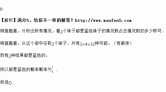 一个袋中里有个珠子,其中个红色,个蓝色,除颜色外其余特征均相同,若从这个袋中任取个珠子,都是蓝色珠子的概率是( )
