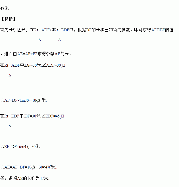 如图,在甲建筑物上从A到E悬挂一条条幅,在乙建筑物顶部D点测得条幅顶端A点的仰角为30º,测得条幅底端E点的俯角为45º,若甲、乙两建筑物之间的水平距离为30米,求条幅AE的长。(结果精确到个位,参考数据