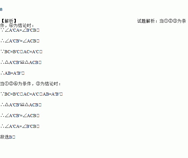 B 【解析】试题解析:当①②③为条件,④为结论时: ∵∠A′CA=∠B′CB, ∴∠A′CB′=∠ACB, ∵BC=B′C,AC=A′C, ∴△A′CB′≌△ACB, ∴AB=A′B′, 当①②④为条件,③为结论时: ∵BC=B′C,AC=A′C,AB=A′B′, ∴△A′CB′≌△ACB, ∴∠A′CB′=∠ACB, ∴∠A′CA=∠B′CB. 故选B.