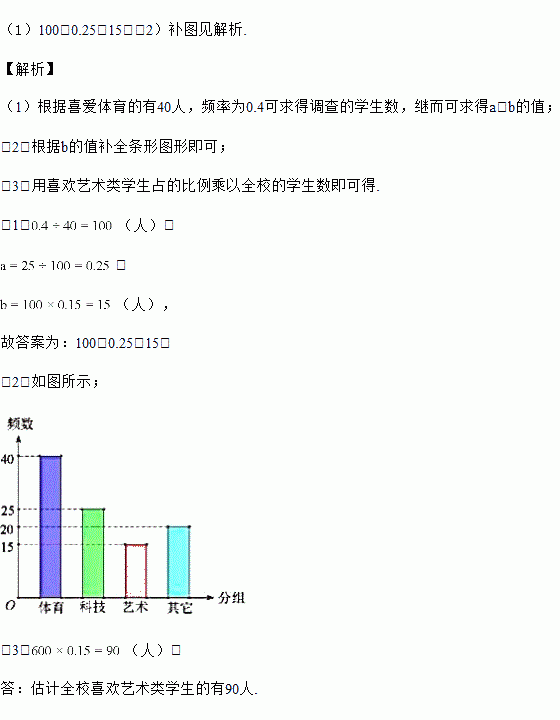 (3)若全校有600人,请你估算一下全校喜欢艺术类学生的人数有多少?