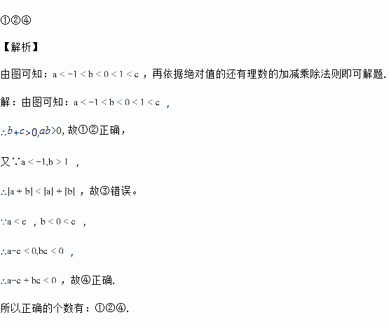 有理数a,b,c在数轴上的位置如图所示,现有下列结论:①b+c>0;②ab>0;③|a+c|=|a|+|c|;④a﹣c+bc<0.其中正确的有_____.(把所有正确结论的序号都填上)