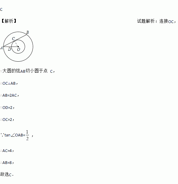 如图,以点O为圆心的两个圆中,大圆的弦AB切小圆于点C,OA交小圆于.点D,若OD=2, tan∠OAB=