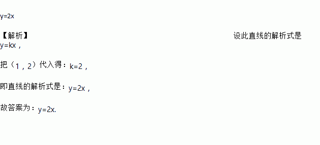 y=2x 【解析】设此直线的解析式是y=kx, 把(1,2)代入得:k=2, 即直线的解析式是:y=2x, 故答案为:y=2x.