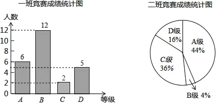 在学校组织的科学素养竞赛中,每班参加比赛的人数相同,成绩分为A,B,C,D四个等级,其中相应等级的得分依次记为90分,80分,70分,60分,学校将八年级一班和二班的成绩整理并绘制成如下的统计图: