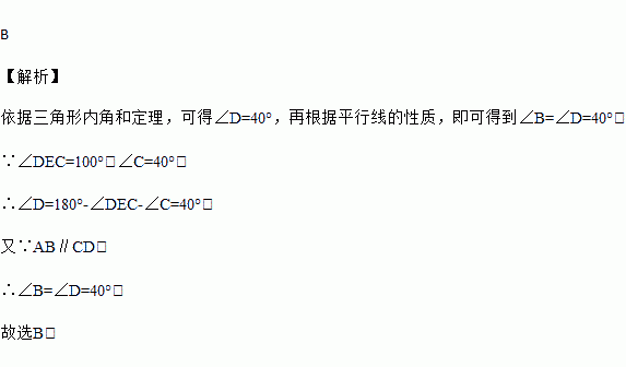 如图,AB∥CD,则∠DEC=100°,∠C=40°,则∠B的大小是( )