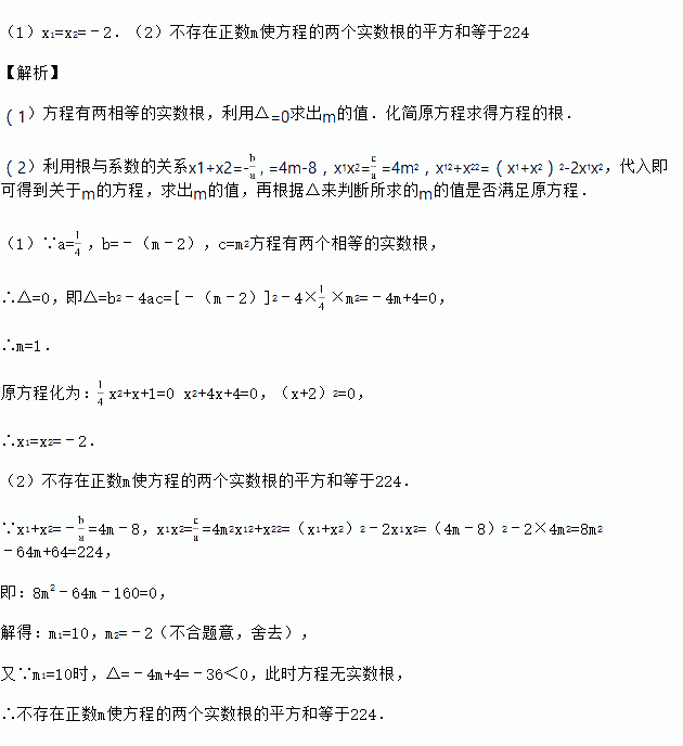(2)是否存在正数m,使方程的两个实数根的平方和等于224.若存在,求出满足条件的m的值;若不存在,请说明理由.