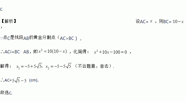 点C是线段AB的黄金分割点(AC>BC),若AB=10cm,则AC等于( )