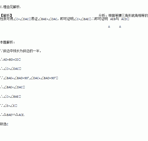 如图,AD是直角三角形ABC斜边上的中线,AE⊥AD交CB延长线于E,则图中一定相似的三角形是 说明理由