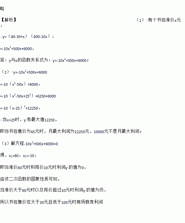 (1)请写出每月售出书包的利润y元与每个书包涨价x元间的函数关系式;