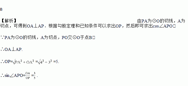 如图,PA为⊙O的切线,A为切点,PO交⊙O于点B,若PA=4,OA=3,则sin∠APO的值为( )