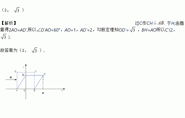 我们知道,四边形具有不稳定性.如图,在平面直角坐标系中,边长为2的正方形ABCD的边AB在x轴上,AB的中点是坐标原点O,固定点A,B,把正方形沿箭头方向推,使点D落在y轴正半轴上点D'处,则点C的对应点C'的坐标为______.