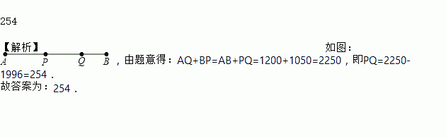 已知线段AB=1996,P、Q是线段AB上的两个点,线段AQ=1200,线段BP=1050,则线段PQ=________.