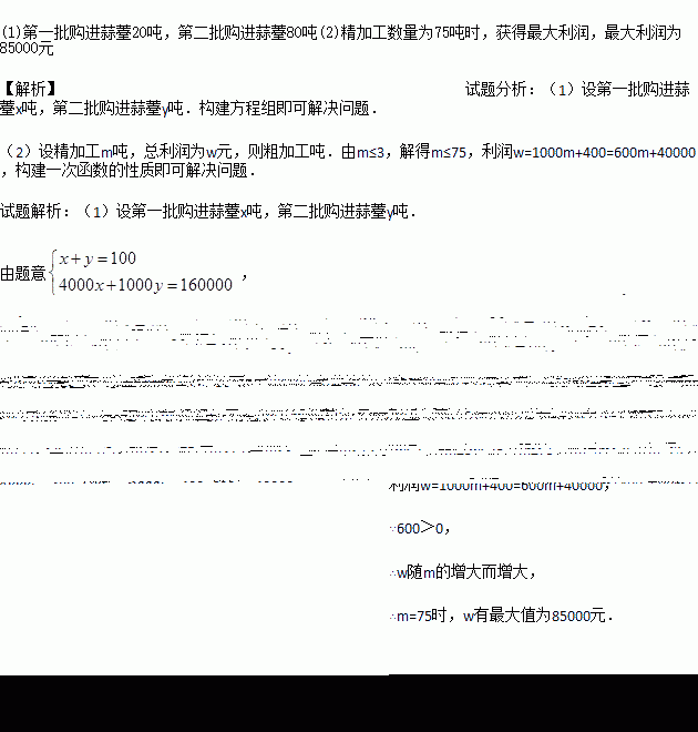 某蔬菜加工公司先后两批次收购蒜薹(tái)共100吨.第一批蒜薹价格为4000元/吨;因蒜薹大量上市,第二批价格跌至1000元/吨.这两批蒜薹共用去16万元.