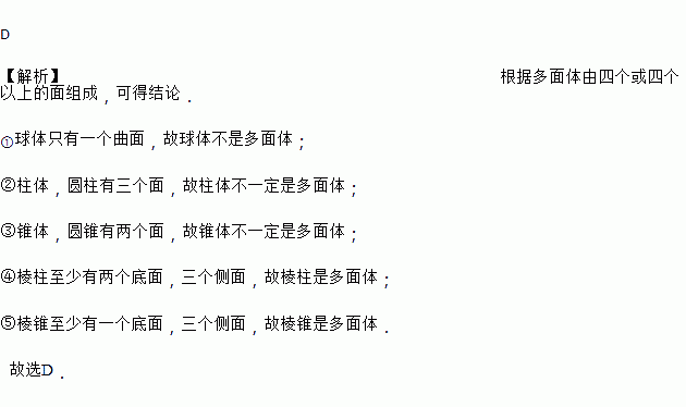 在①球体;②柱体;③锥体;④棱柱;⑤棱锥中,必是多面体的是( )