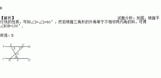 B 【解析】试题分析:如图,根据平行线的性质,可知∠3=∠2=60°,然后根据三角形的外角等于不相邻两内角的和,可得∠EOH=100°. 故选:B